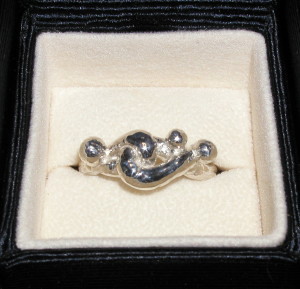 | 作品 その1 体験時の指輪です。この形にするつもりじゃぁなかったんですが・・・。デザインを決め、粘土状の物を長さを決めて、水で湿らせながら伸ばす。 プレッシャーかかるんですよ。時間もないし、あまり長い時間伸ばしていると、乾燥してヒビ入ってくるし、サイズの棒に巻きつけたとき、切れてしまって焦りました。 水を足してまた最初から伸ばしたら、今度は長すぎて余分な粘土を切りました。 残りは勿体ないので、3つの玉つくって付けました。 そしたら こんなん出来ました。 |