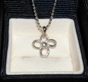 | 作品 その2 体験時の雪辱をはらすべく?キットを購入しシルバー製作に励むことにしました。 ペンダントヘッドを作ってみました。キットにはノーマルの粘土が入っております。前回同様、早めの伸ばしでないと乾燥します。水つけながら(恐らく)必死な形相で 形作って、本当は4つではなく5つにする予定が・・・・・。 予定は未定?といいつつ。 結構気に入っている作品になりました。 最初にしては上出来? |